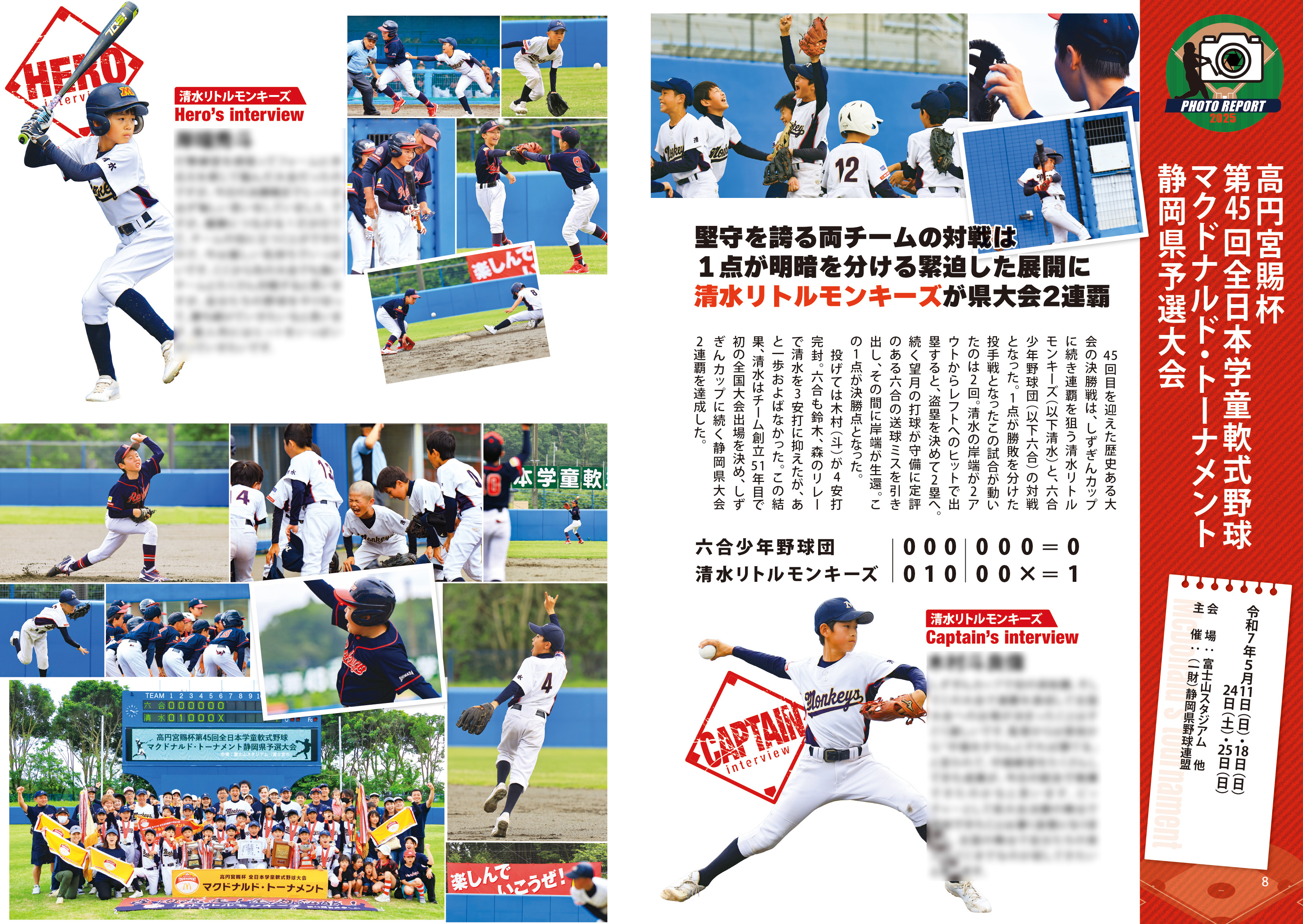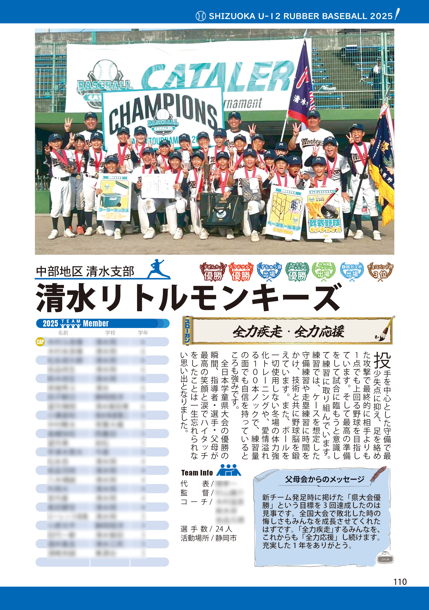 静岡県野球連盟監修のもと、県内の学童野球チームを紹介する選手名鑑です。